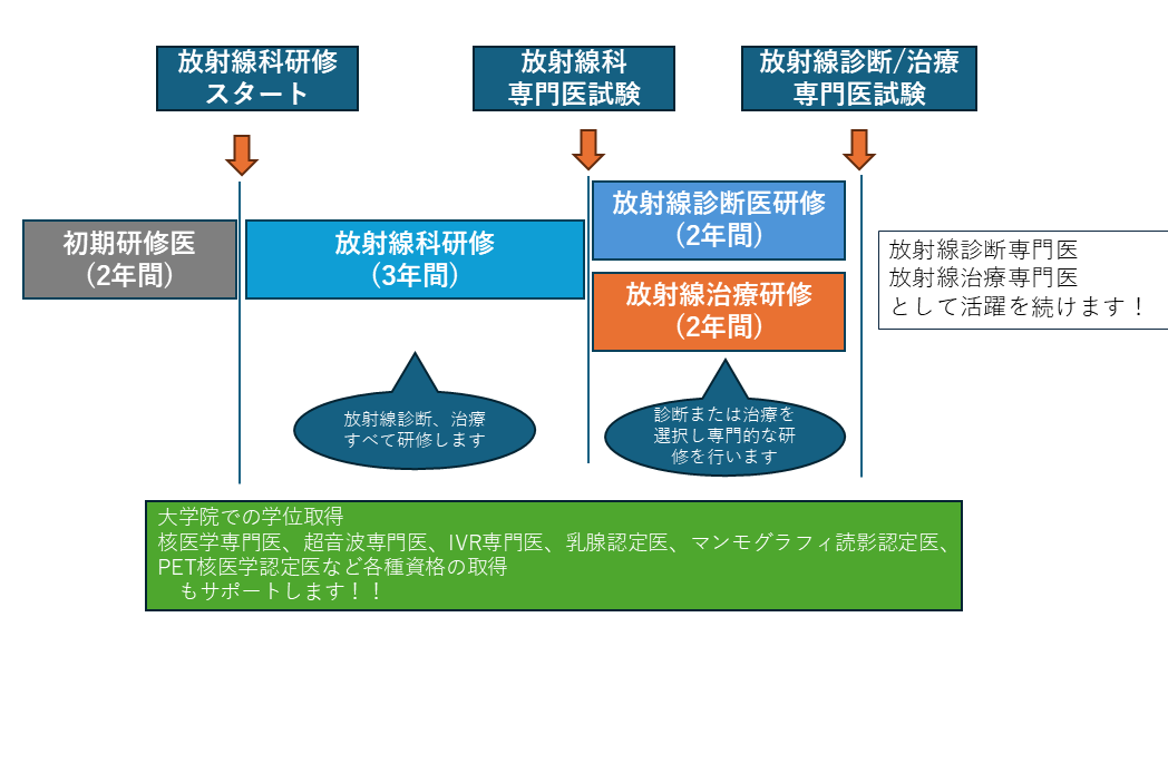 まず、初期研修(2年間)を修了した後、放射線科専門研修(3年間)を行い、放射線科専門医試験に合格すると放射線科専門医を取得できます。その後、さらに放射線診断または放射線治療の専門研修(2年間)を修了し、それぞれの専門医試験に合格することで、放射線診断専門医または放射線治療専門医の資格を取得できます。