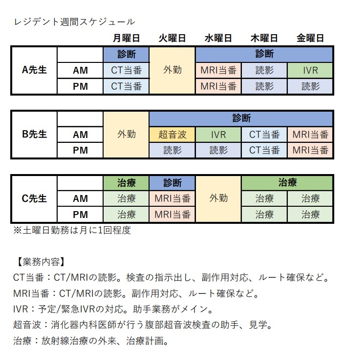 - A. 第3土曜日以外は病院が稼働していますが、当番制で交代勤務です(月1回程度)。 土曜日に当番となった場合は、平日に代休を取得できます。そのため、無理のない勤務スケジュールが組めます。以下レジデントの一週間のスケジュールの例です。
